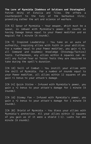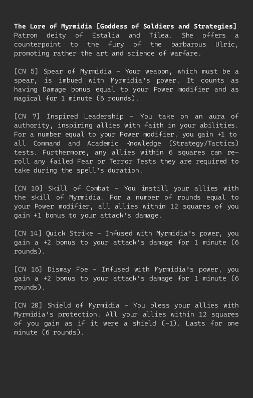 9 Divine Lores (Manann, Morr, Myrmidia, Ranald, Shallya, Sigmar, Taal and Rhya, Ulric, and Verena)